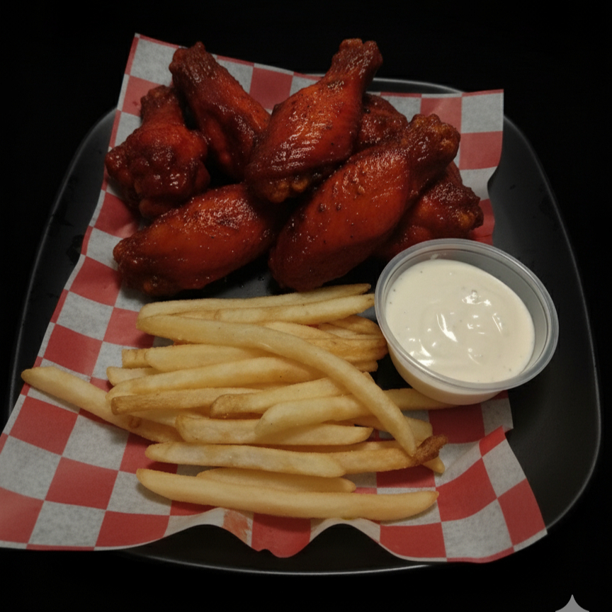 6 alas de pollo enchiladas con una porción de papas a la francesa sencilas y un ader zo ranch