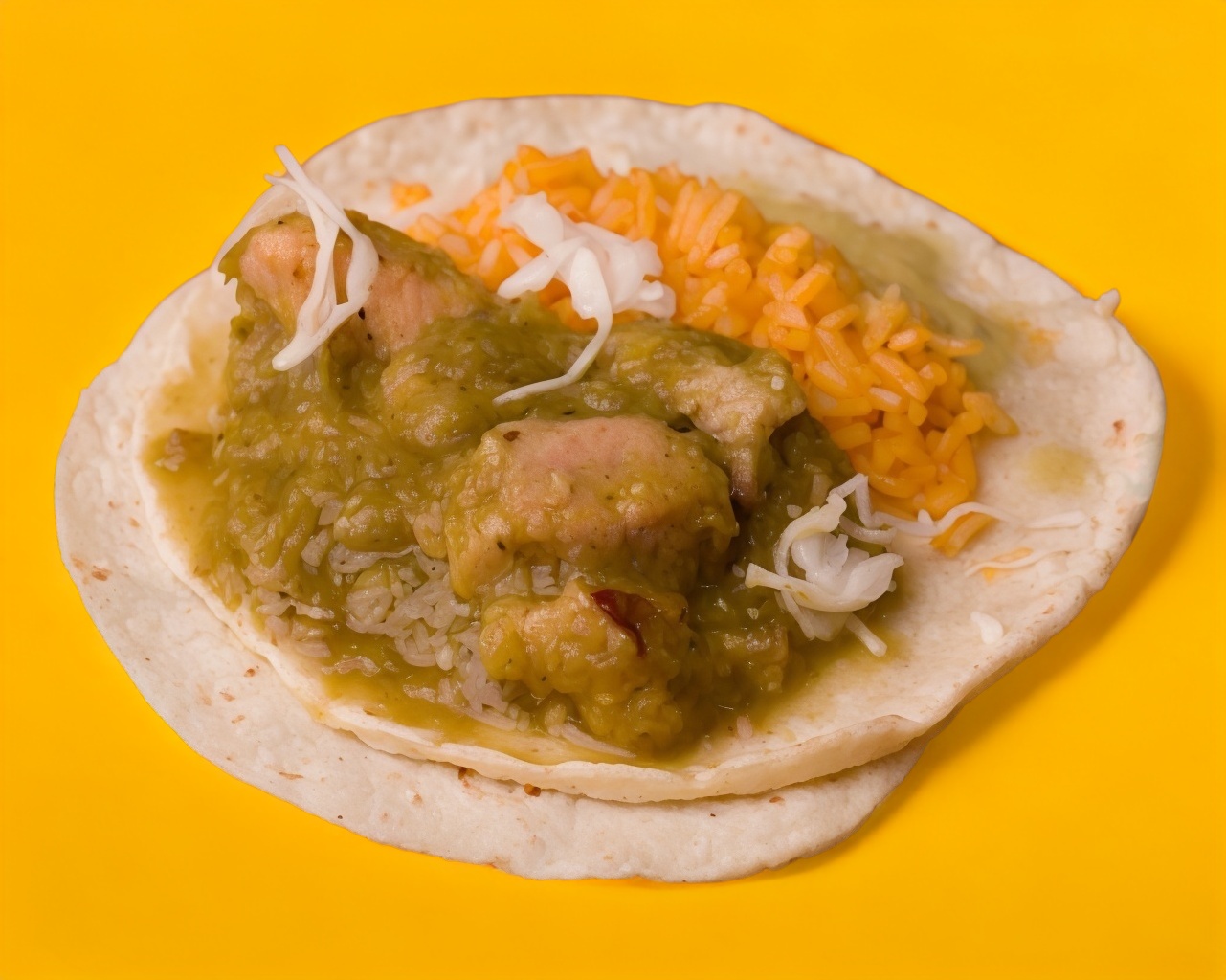 Taco de Costilla de Cerdo Guisada en Salsa Verde acompañado de Arroz, Tortilla de Maiz, Ensalada, Limón y Salsa.