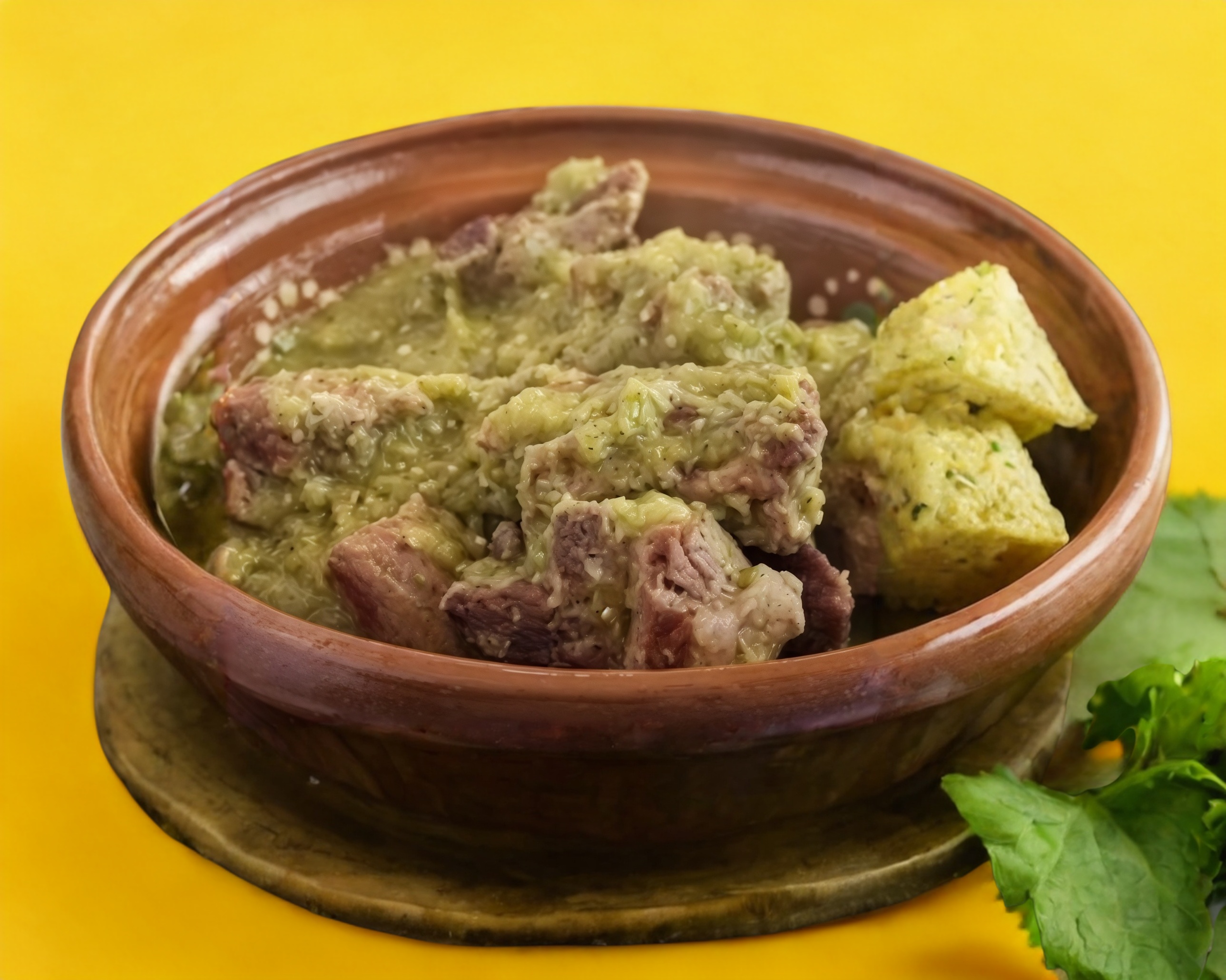 200 grs aprox de Costillas de Cerdo Guisadas en Salsa de Tomate Verde, acompañadas de Arroz Blanco, Frijoles Negros, Platanos Fritos, Tortillas de Maiz, Limon y Salsa.