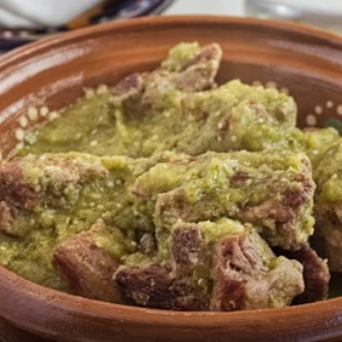 500 Grs de Cosrtillas de Cerdo Guisadas en Salsa de Tomate Verde , acompañadas de Arroz Blanco, Frijoles Negros, Platanitos Fritos, Tortillas de Maiz, Limon y Salsa.