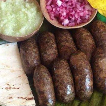 Rico embutido de carne de cerdo y res con especias con toque de pimienta, acompañado de tortillas, salsa jalpaneca y cebolla curtida. El producto se pesa en crudo antes de freir