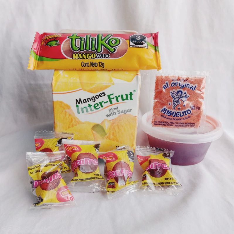 1 Pza mango congelado 283 gr, acompañado de 3 Oz chamoy + 4 gr Miguelito en polvo + 2 Topping a elegir.