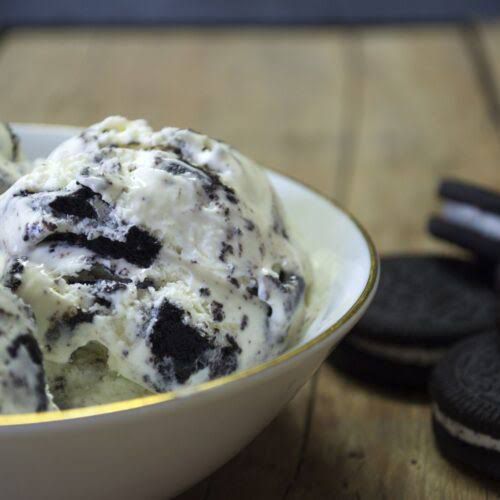 1/2 lt helado de vainilla con trozos de galleta oreo acompañado de 2 topping.