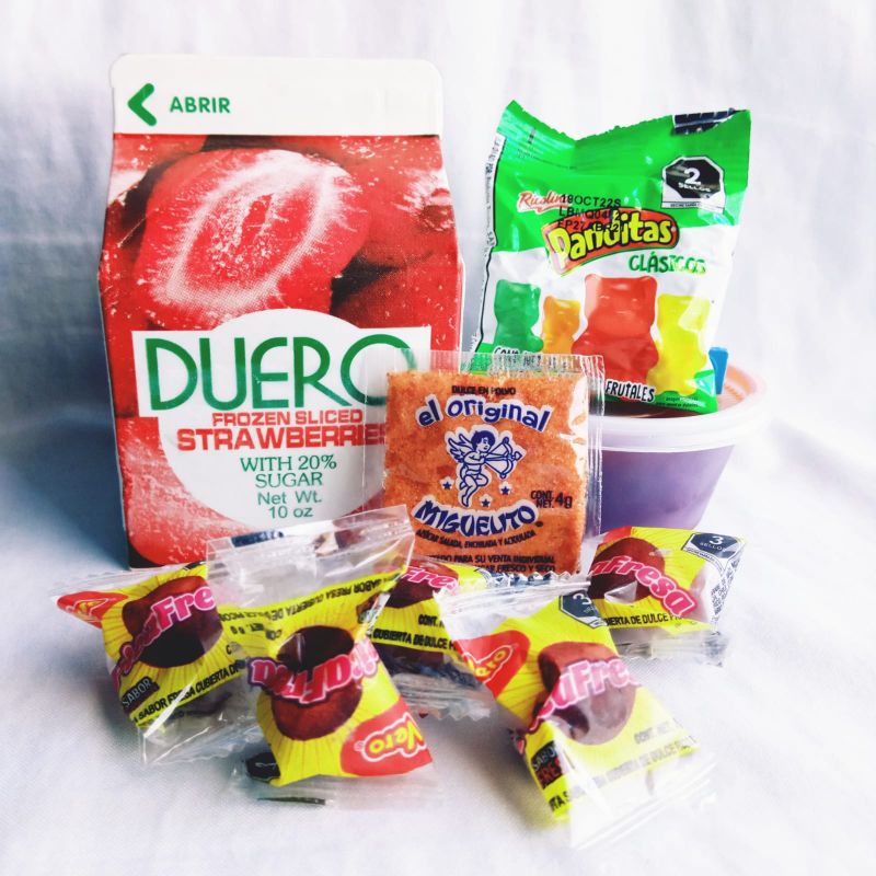1 pza fresa congelada 283 gr, acompañado de 3 oz chamoy + 4 gr miguelito en polvo + 2 topping a elegir.