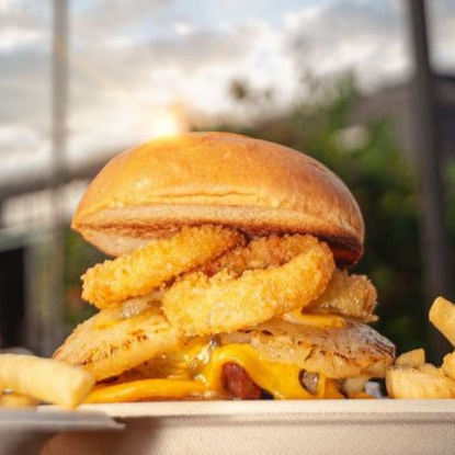 2 rebanadas de piña caramelizada, aros de cebolla caseros, tocino frito, 150gr de carne y queso mozarella.