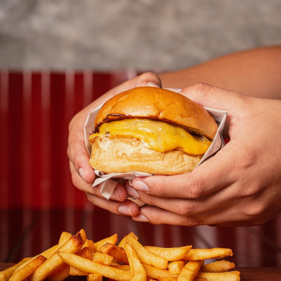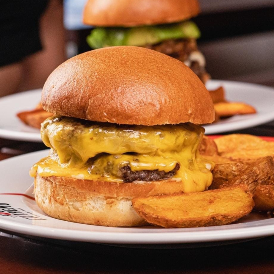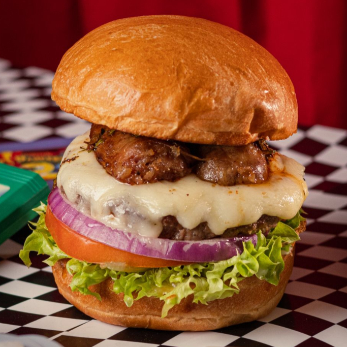 Con doble carne (110gr. cada una) y doble queso americano, pepinillos, cebolla caramelizada y salsa fuego extremo.