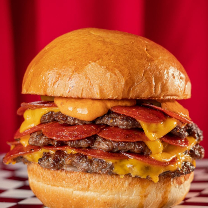 con triple carne (110gr. cada una), triple pepperoni y triple queso americano, pepinillos, cebolla caramelizada y salsa Fuego Extremo