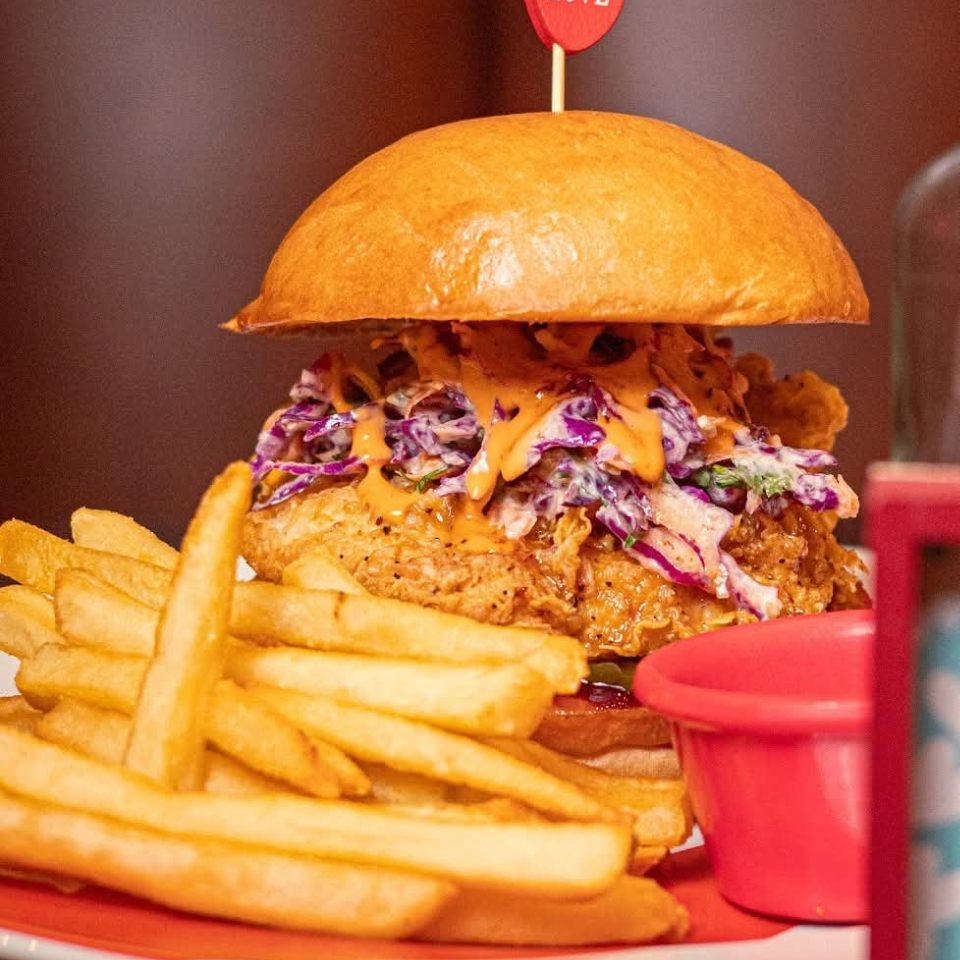 Mermelada de fresa-tocino, pepinillos, 160gr de pechuga de pollo estilo cajun, ensalada coleslaw, sweet siracha y salsa FE.
