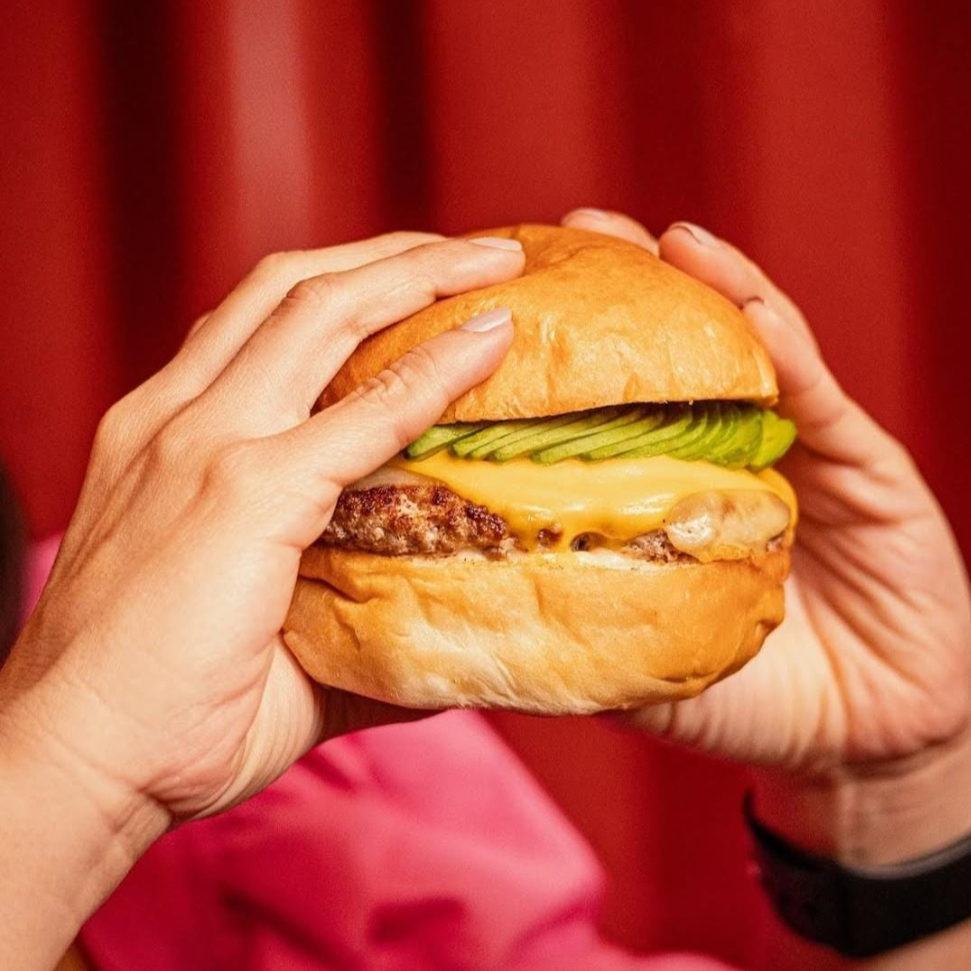 Medio aguacate cortado en abanico, 150gr de carne, queso monterrey jack y queso cheddar en un delicioso bollo de mantequilla.