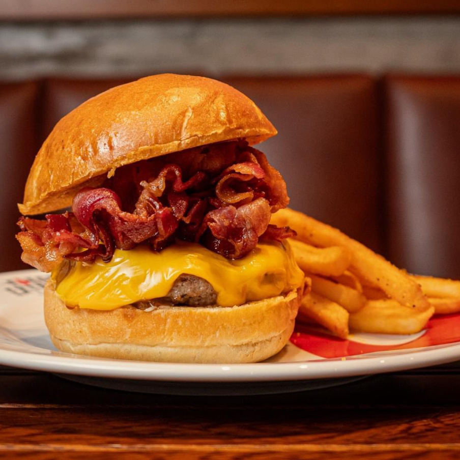 Extra tocino, cebolla caramelizada, queso cheddar, queso monterrey y 150gr de carne.