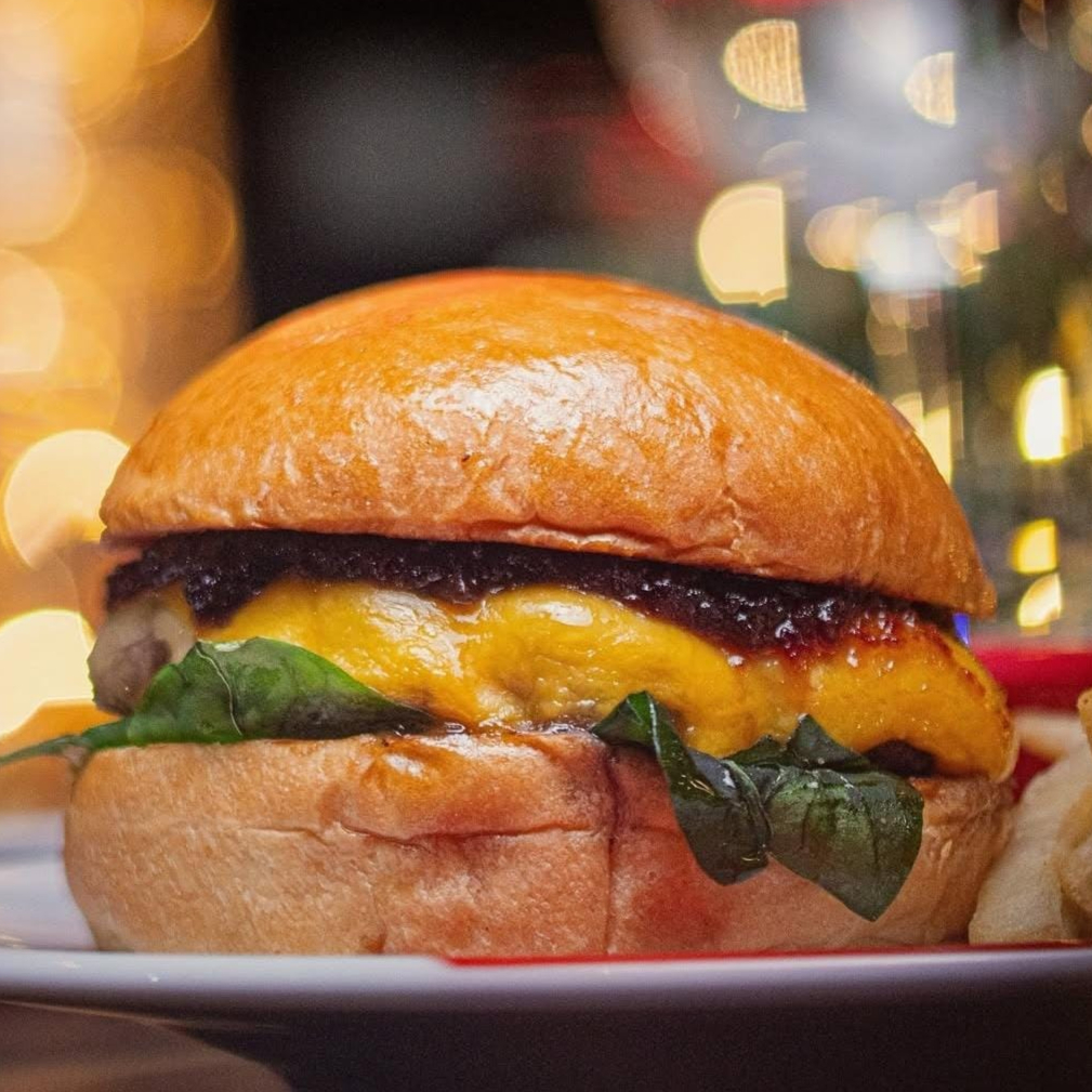 Gastrique de arándanos, queso de cabra, cebolla caramelizada, espinaca, aderezo dijonaise, 150 gr de carne, queso cheddar y queso monterrey jack.