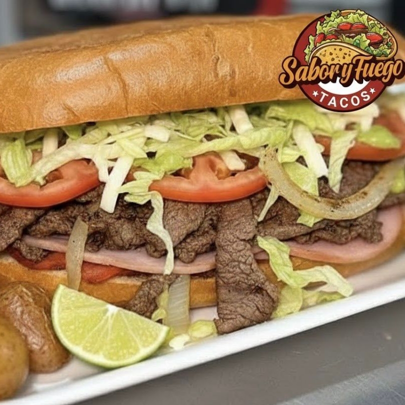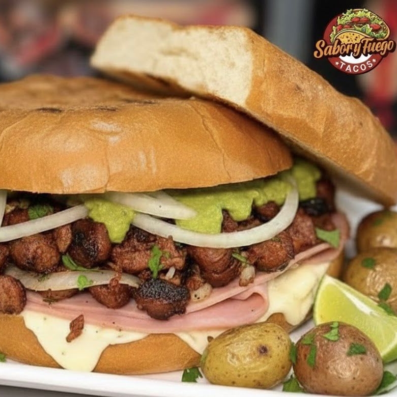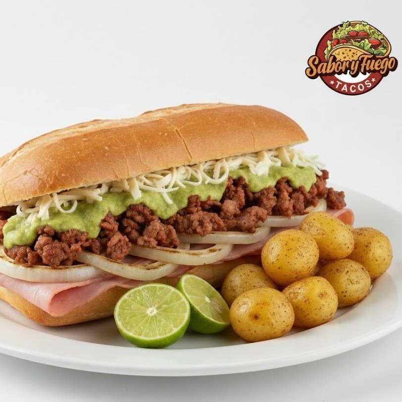 cebolla asada, tomate, lechuga, mayonesa, frijol, queso hebra, jamón.