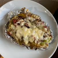 PAPA NATURAL CON CARNE ASADA DE CERDO Y QUESO FUNDIDO ACOMPAÑADA DE CEBOLLA, CILANTRO, CEBOLLA ASADA Y TORTILLAS