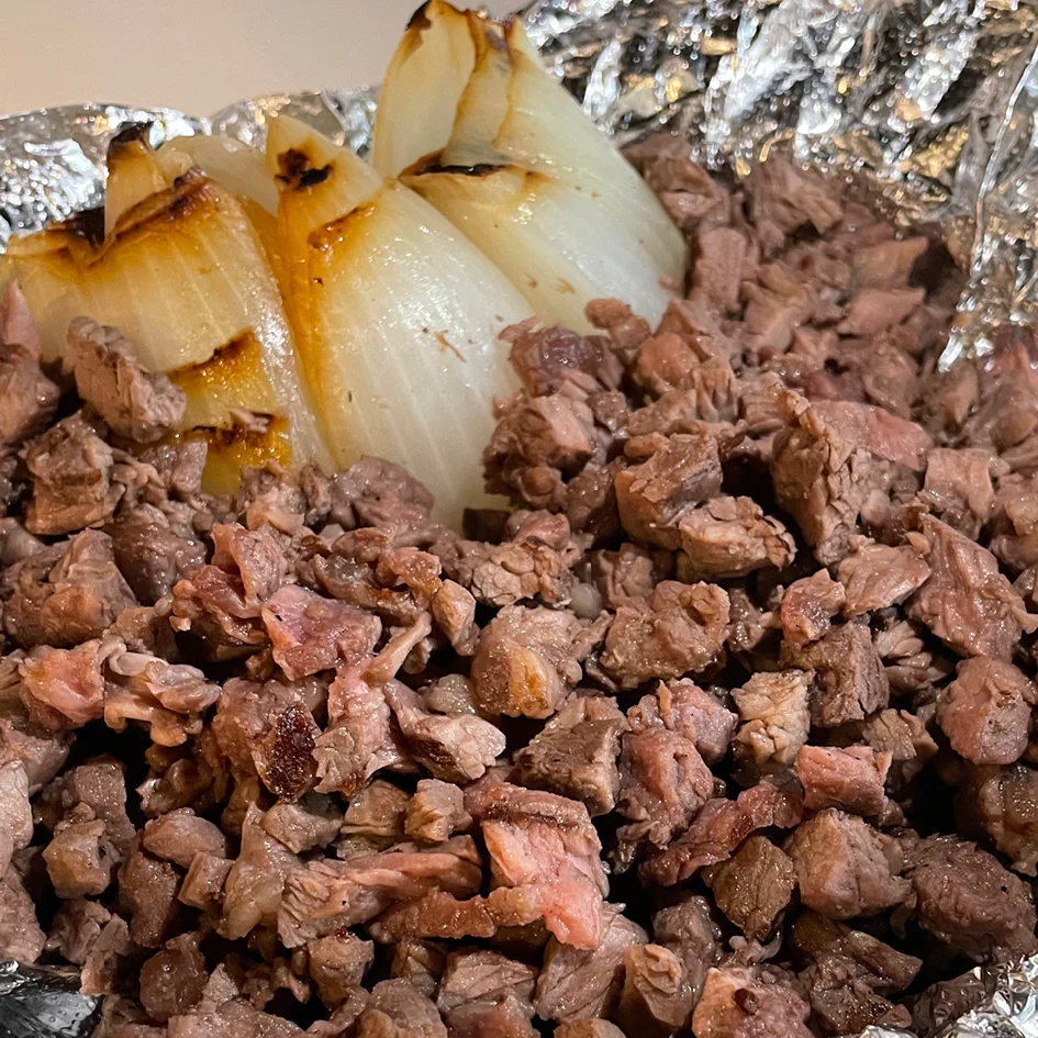 cebolla, cilantro, acompañado de cebolla asada