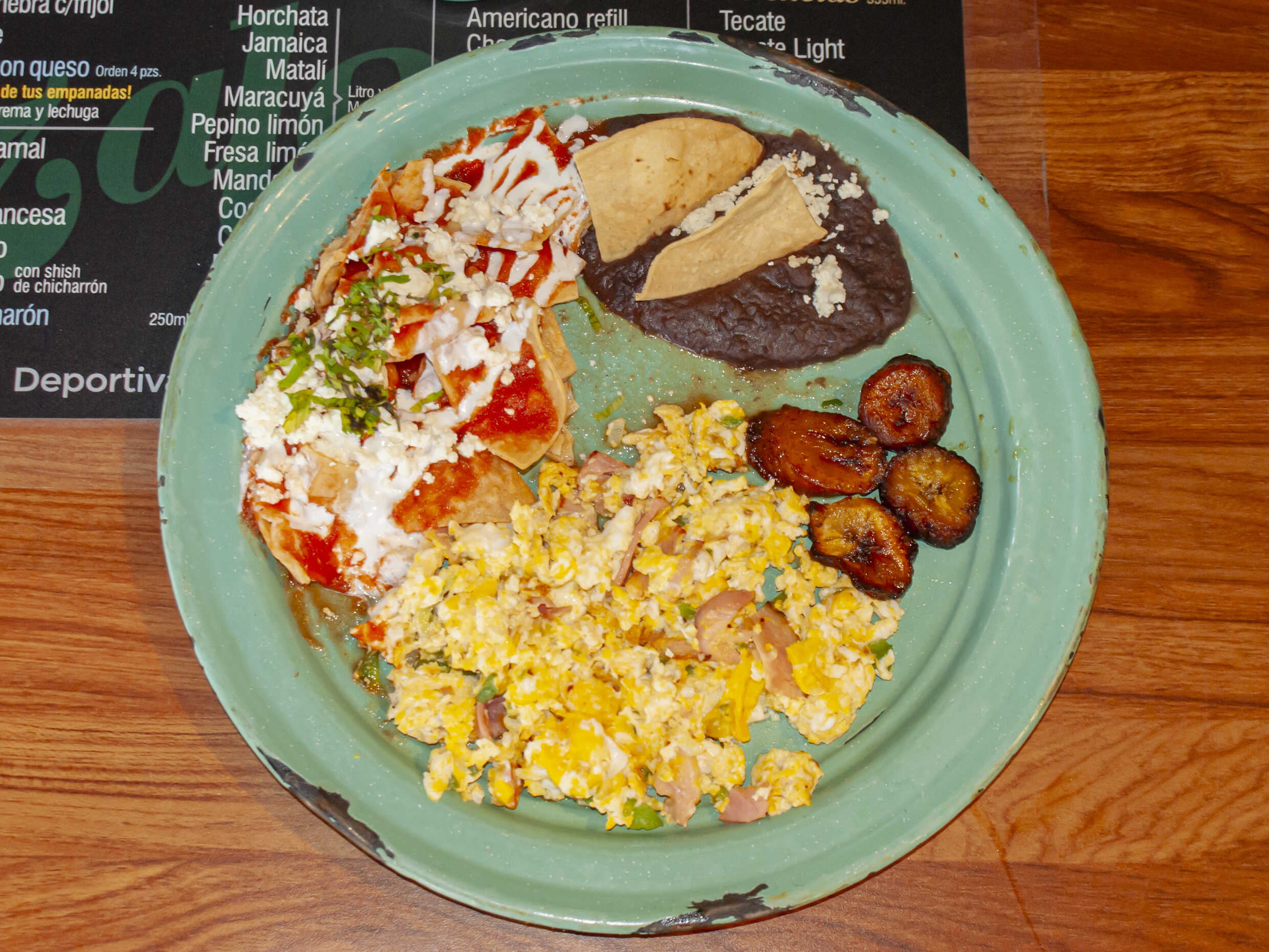 2 huevos estrellados bañados en salsa norteña, cecina , frijolitos y platanitos