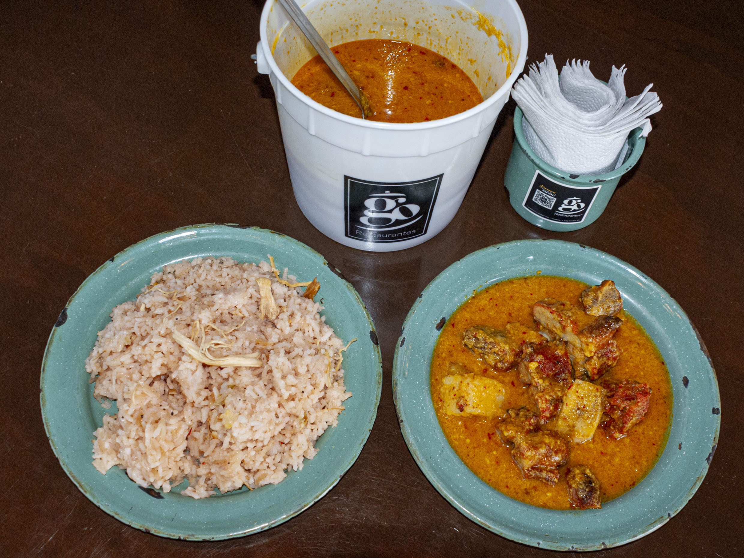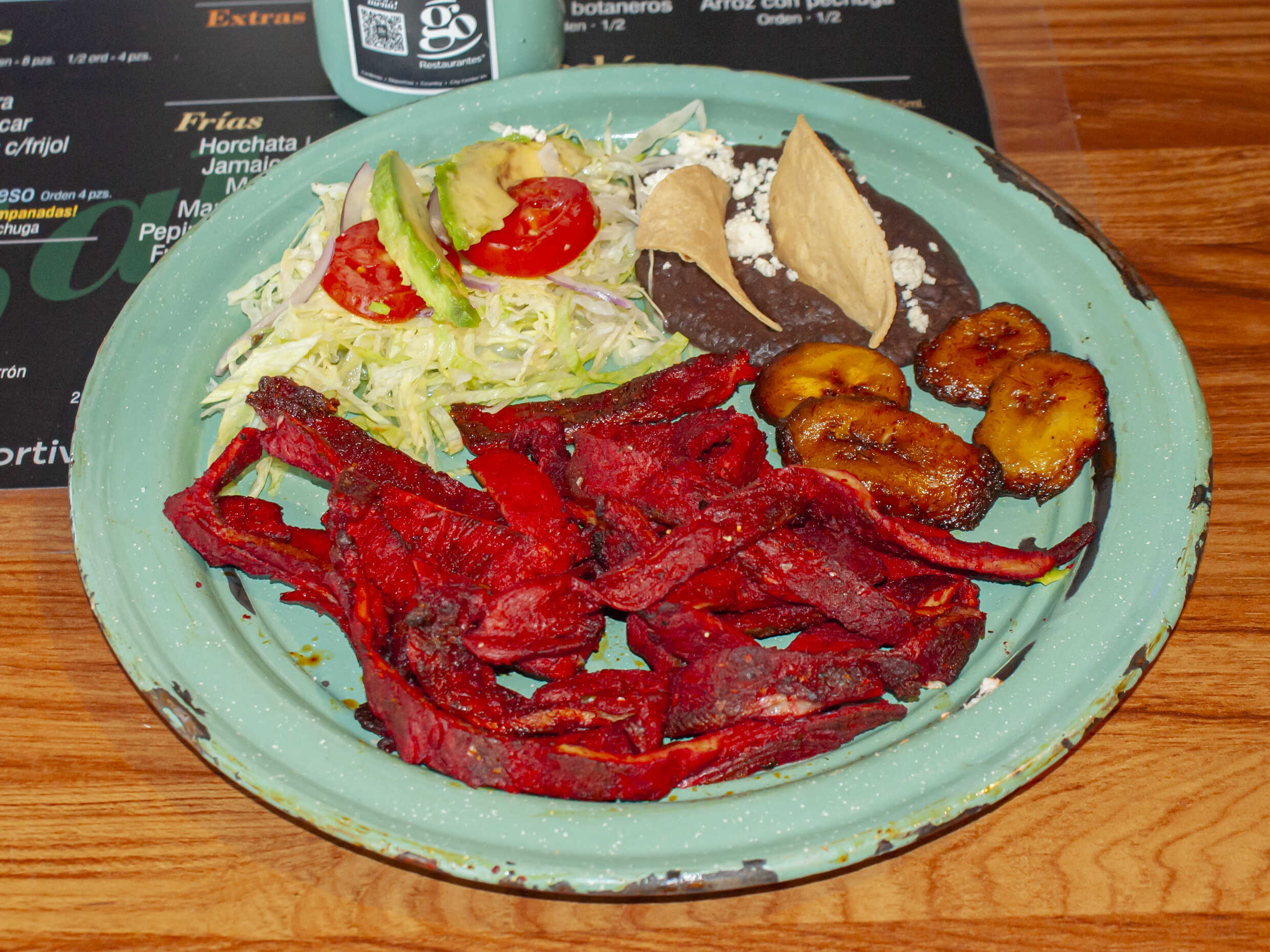 carne con tomate,cebolla, pimiento morrón, cilantro y Chile habanero con guarnición de frijol platanitos fritos