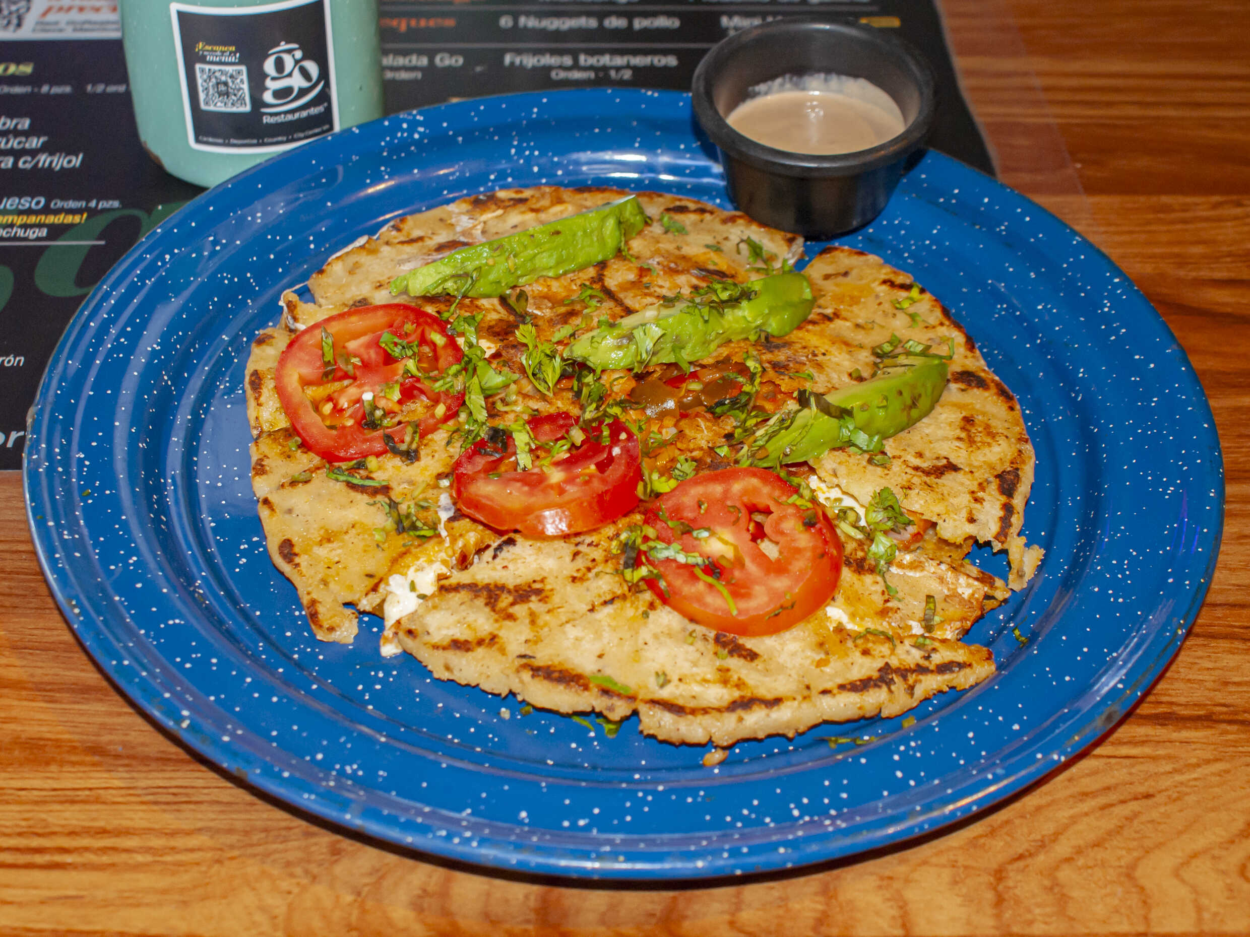 Tortilla rellena de pollo revuelto y cecina, acompañada de salsa de tomate suave, cebolla, cilantro, queso doble crema y crema fresca.