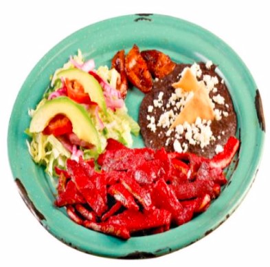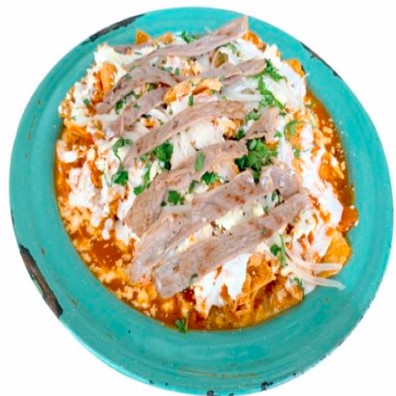 Cecina con chilaquiles, huevos, frijoles y plátanitos.