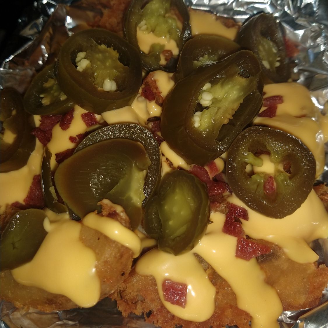 papas gajo, queso derretido, jalapeño en rodajas y tocino molido