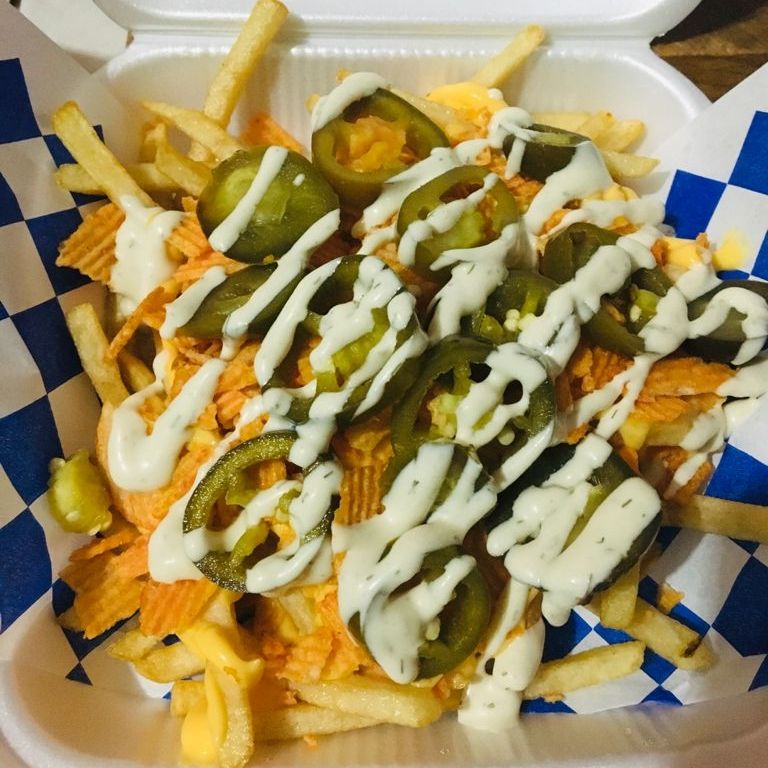 papas francesa, queso chedar, ruffles, rodajas de jalapeños y ranch jalapeño