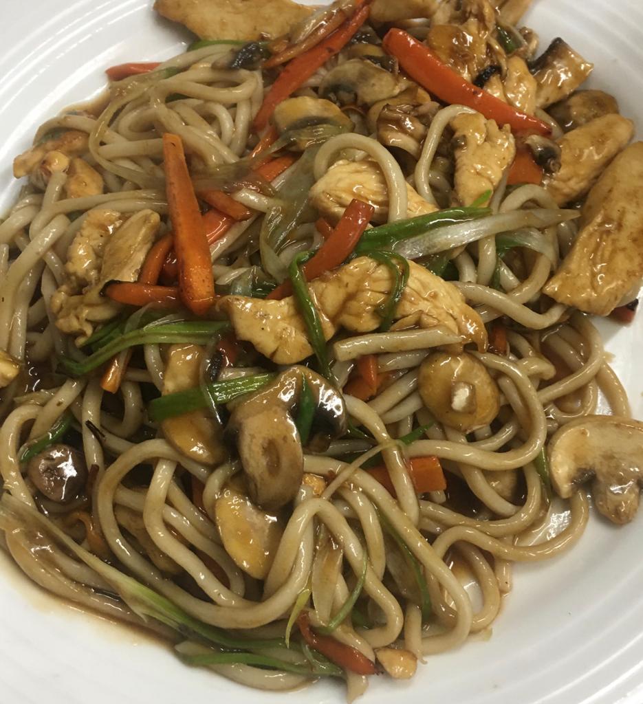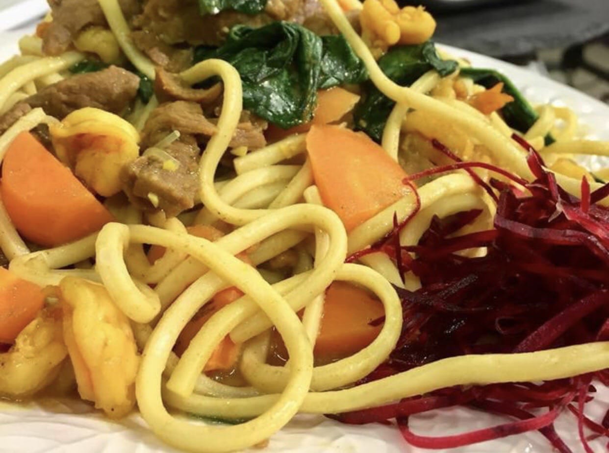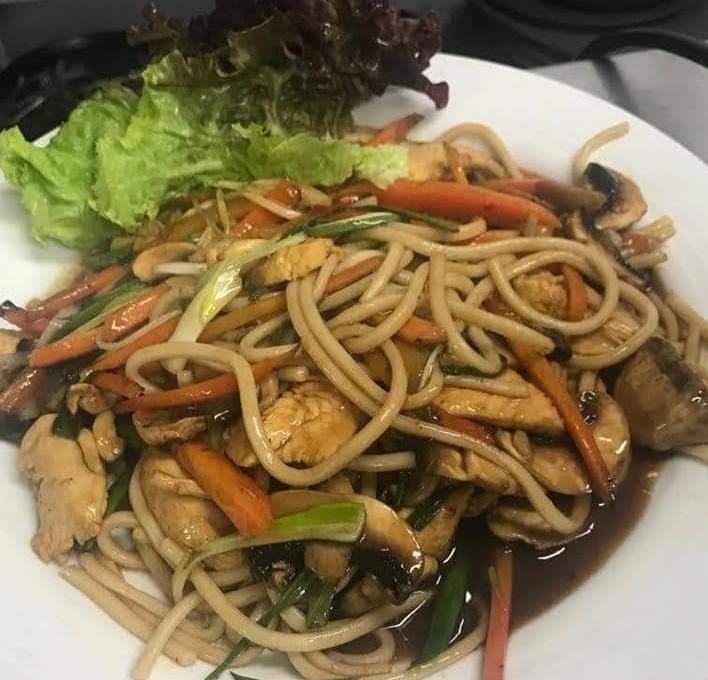 Pasta oriental con pollo, camaron, res y salsa de Ostion.