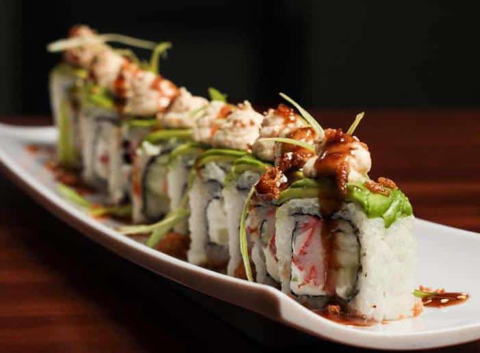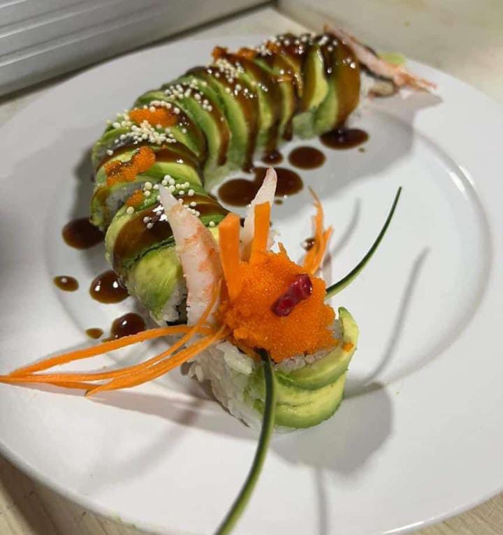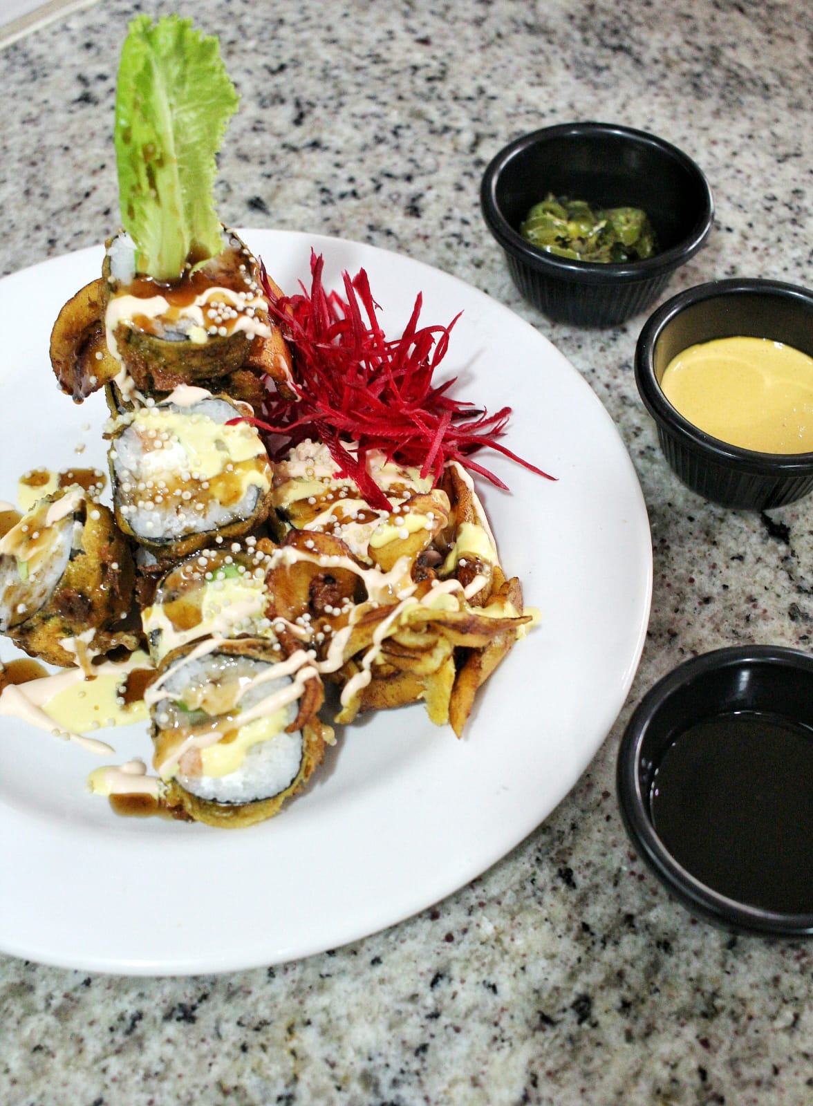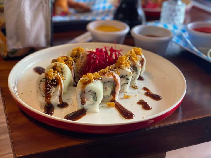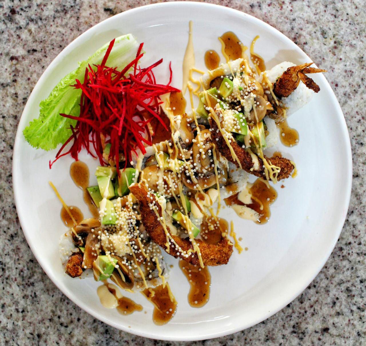 Camarón empanizado, aguacate, hongos, shitakes, calamar, salsa de anguila.