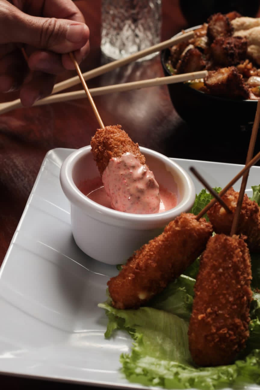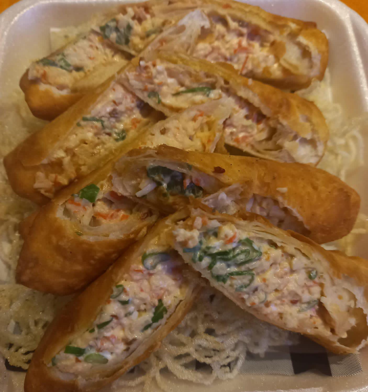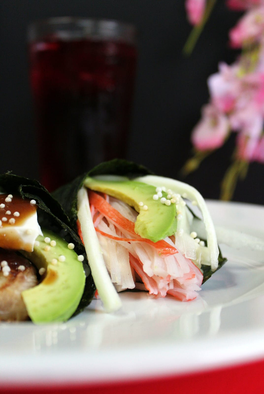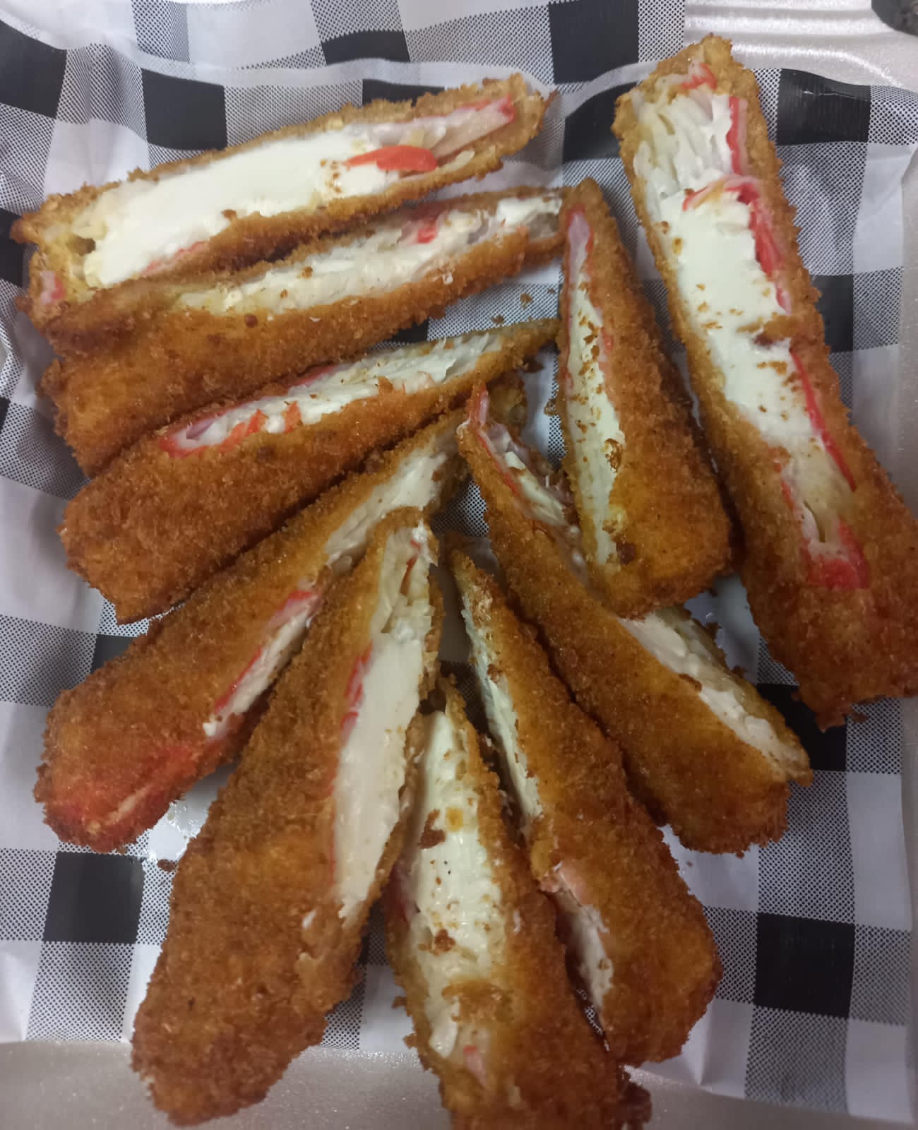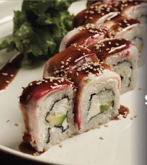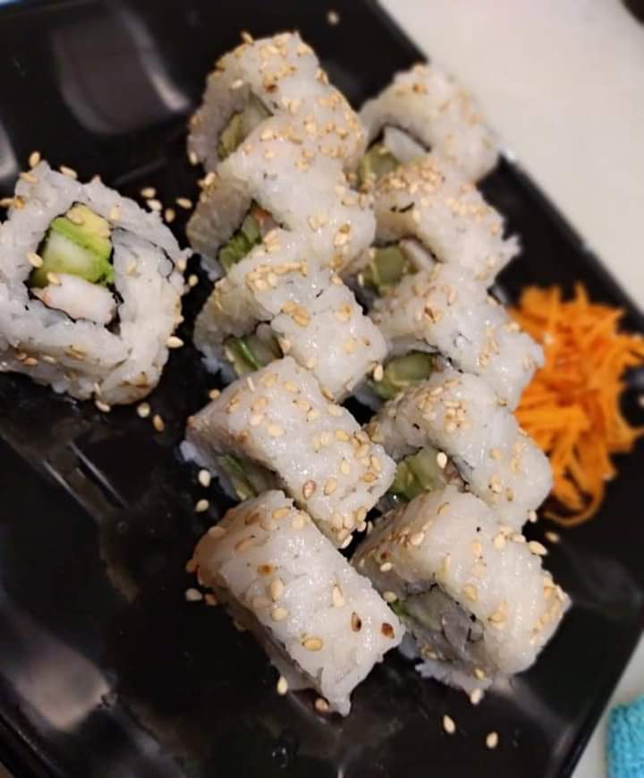 Pepino, queso, aguacate, pasta decangrejo y salmón picado con salsadulce.