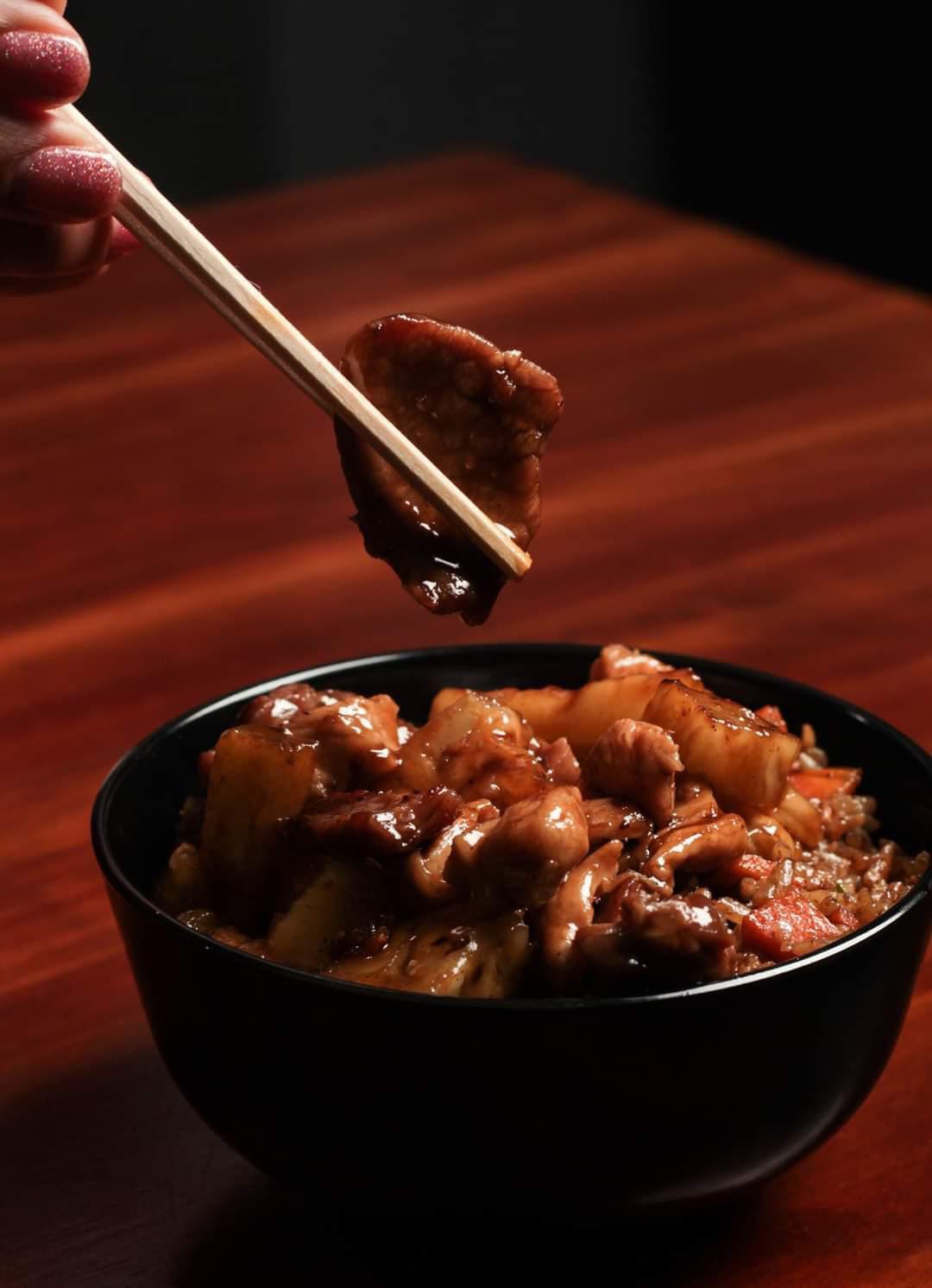 Crujientes trozos de pollo, piña, verduras y salsa agridulce.