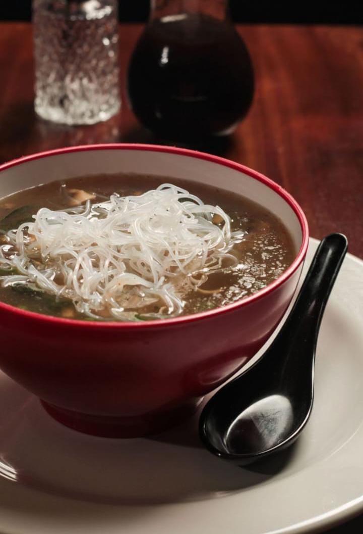Consome ligero con espinaca y ravioles rellenos de pollo.