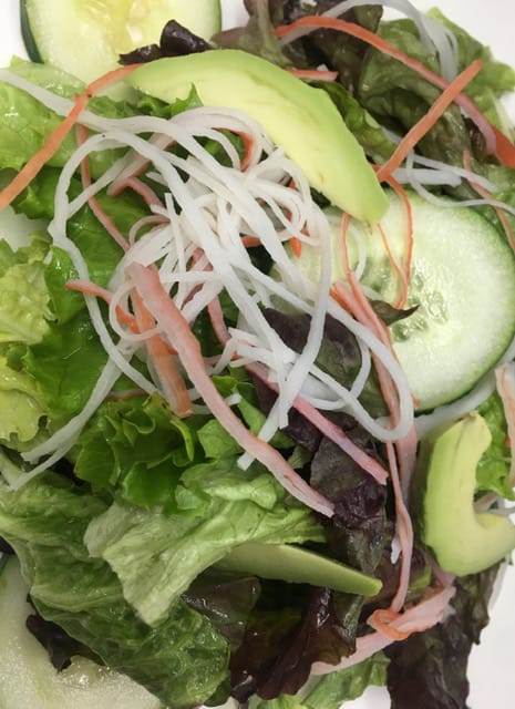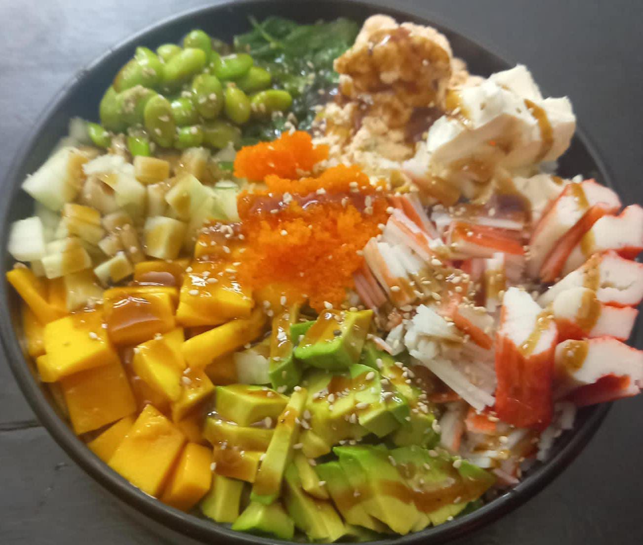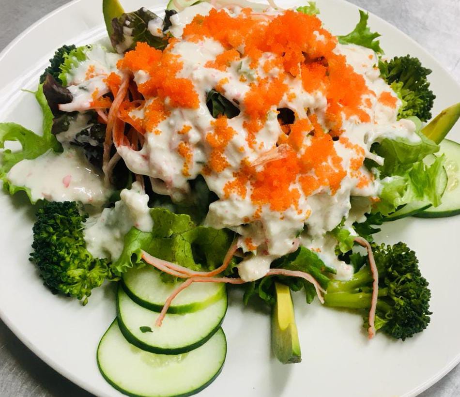Lechuga, brócoli, espinaca, champiñón, cangrejo, aderezo de yogurt y masago.