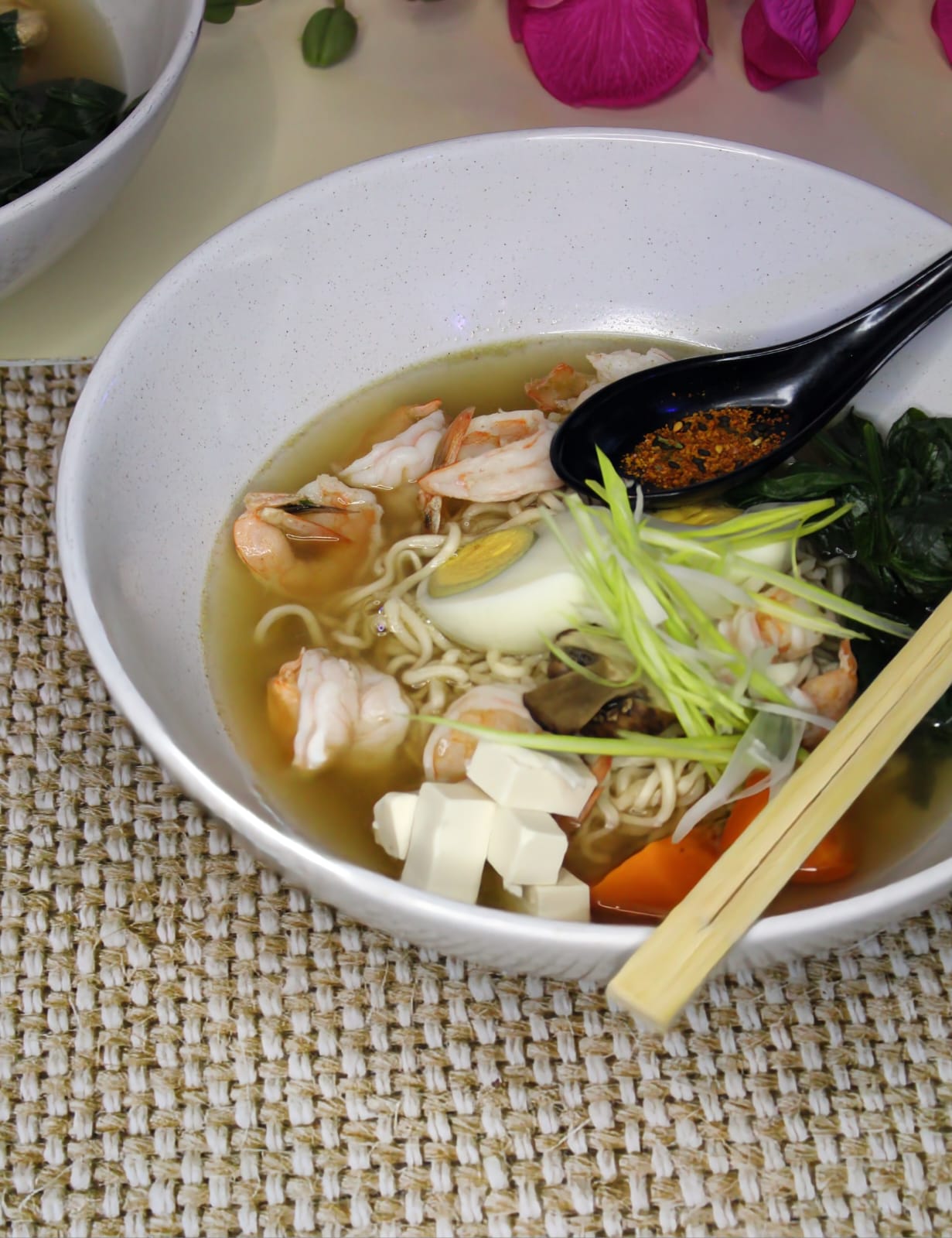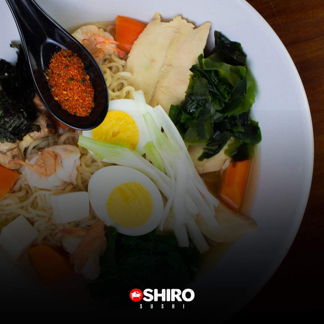 Tofu, huevo, cebollin, espinaca, wakame, naruto y shichimi.