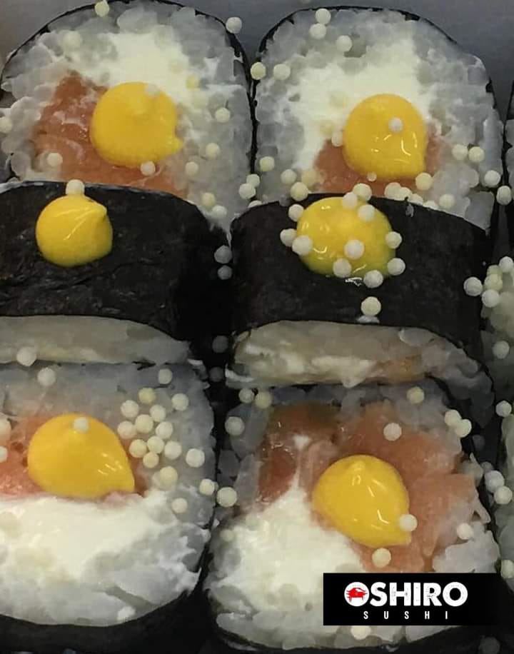 Alga, atun ahumado, queso, aguacate, crounche de zanahoria con cebollin.