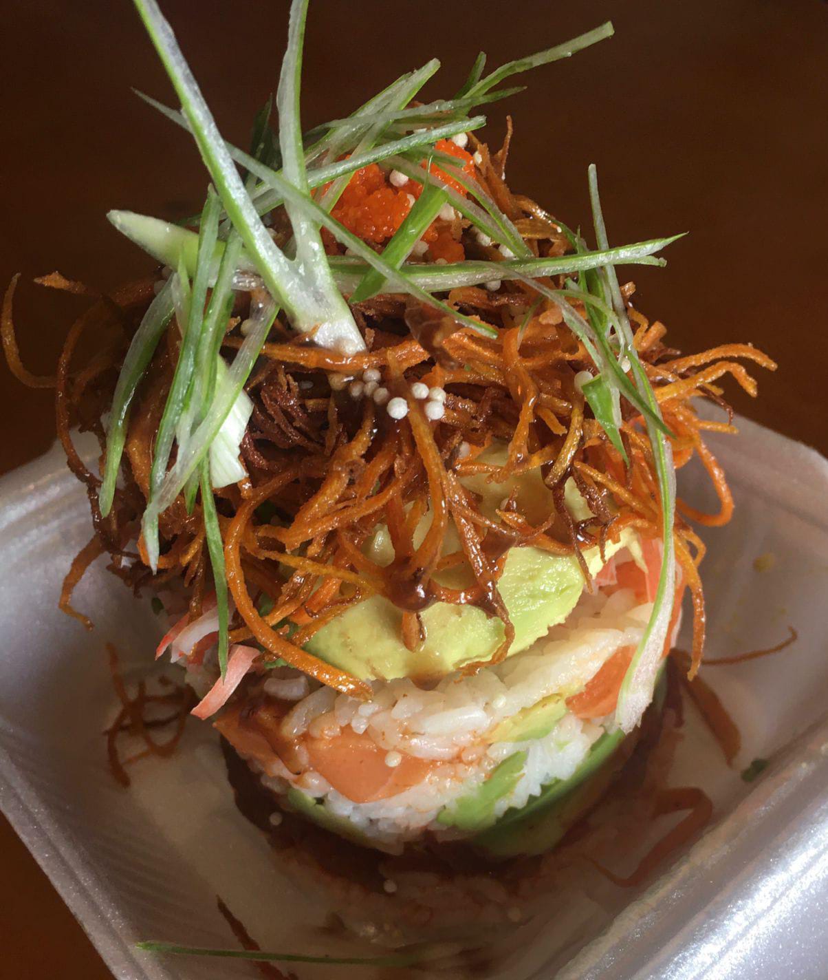 Atún spicy, masago, salmón, cangrejo, tampico, aguacate y salsa dulce.