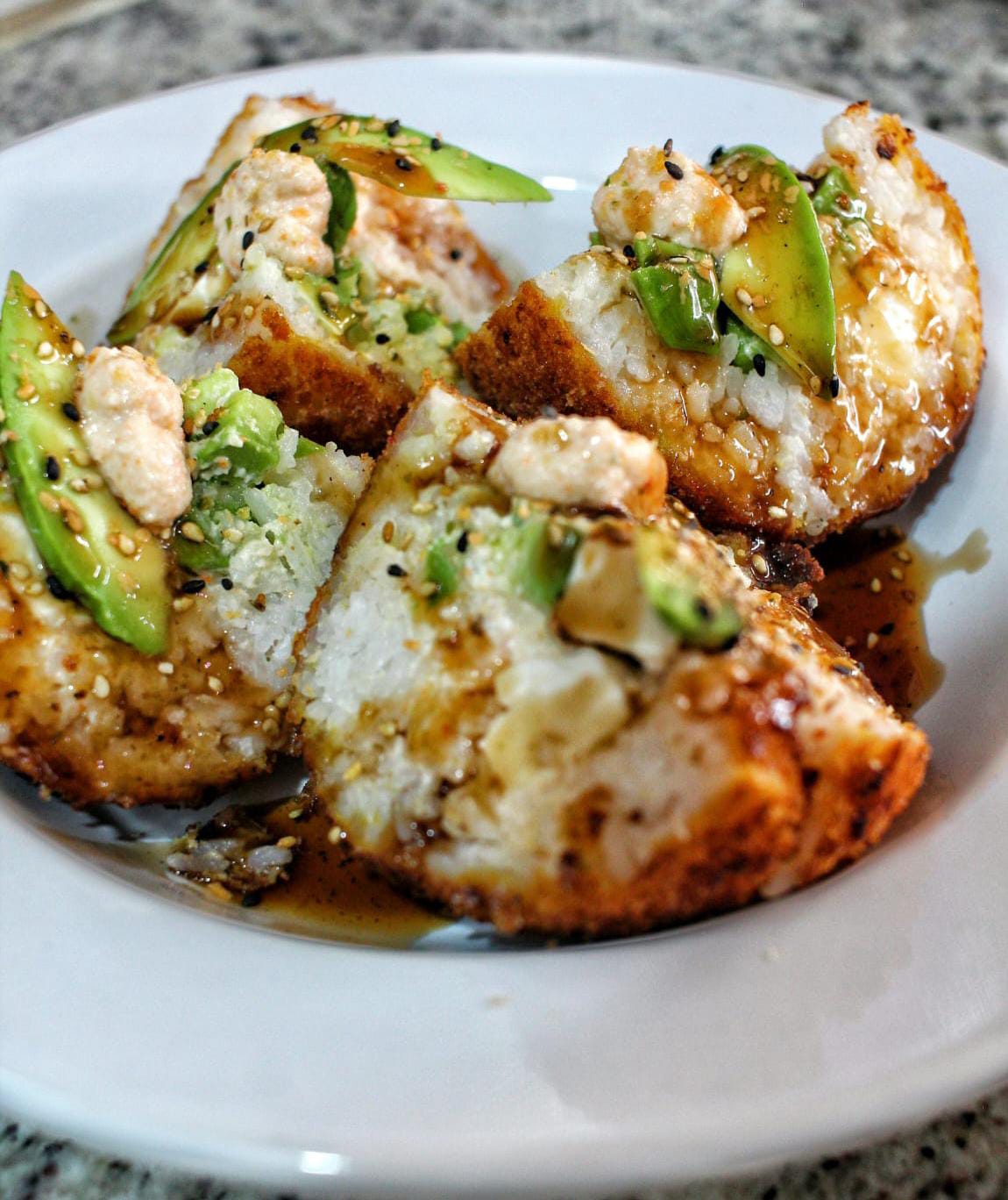 Kani, queso filadelfia, pepino, aguacate, atún crujiente con salsa tare.