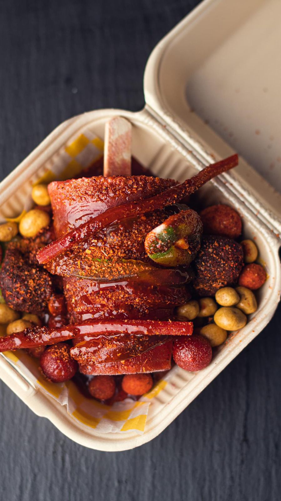 Paleta de agua con chamoy, chile, gomitas y cacahuates.
