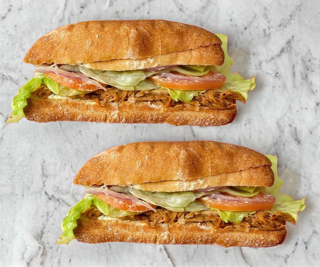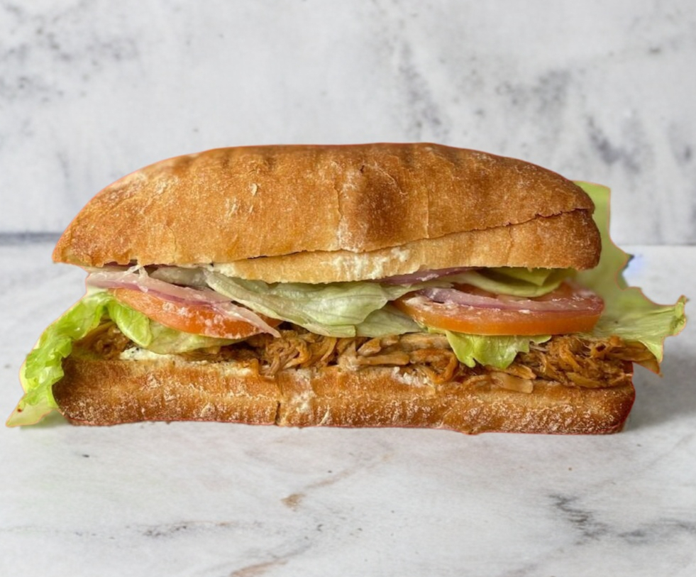 Baguette de 30 cm relleno de pollo y vegetales (lechuga, jitomate, cebolla, aguacate).