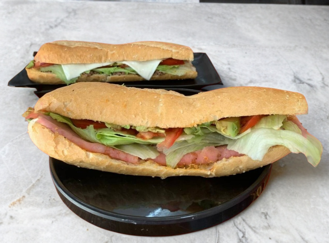 Baguette de 30 cm relleno de jamón, 4 quesos y vegetales (lechuga, jitomate, cebolla, aguacate).