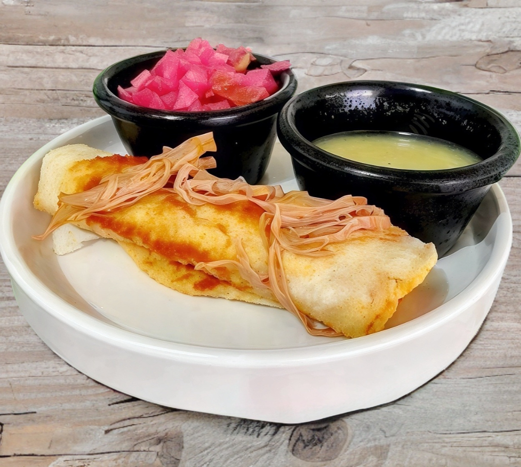 Pan chapata relleno de ingredientes tradicionales de la región, incluye vegetales (lechuga, tomate, cebolla, aguacate)