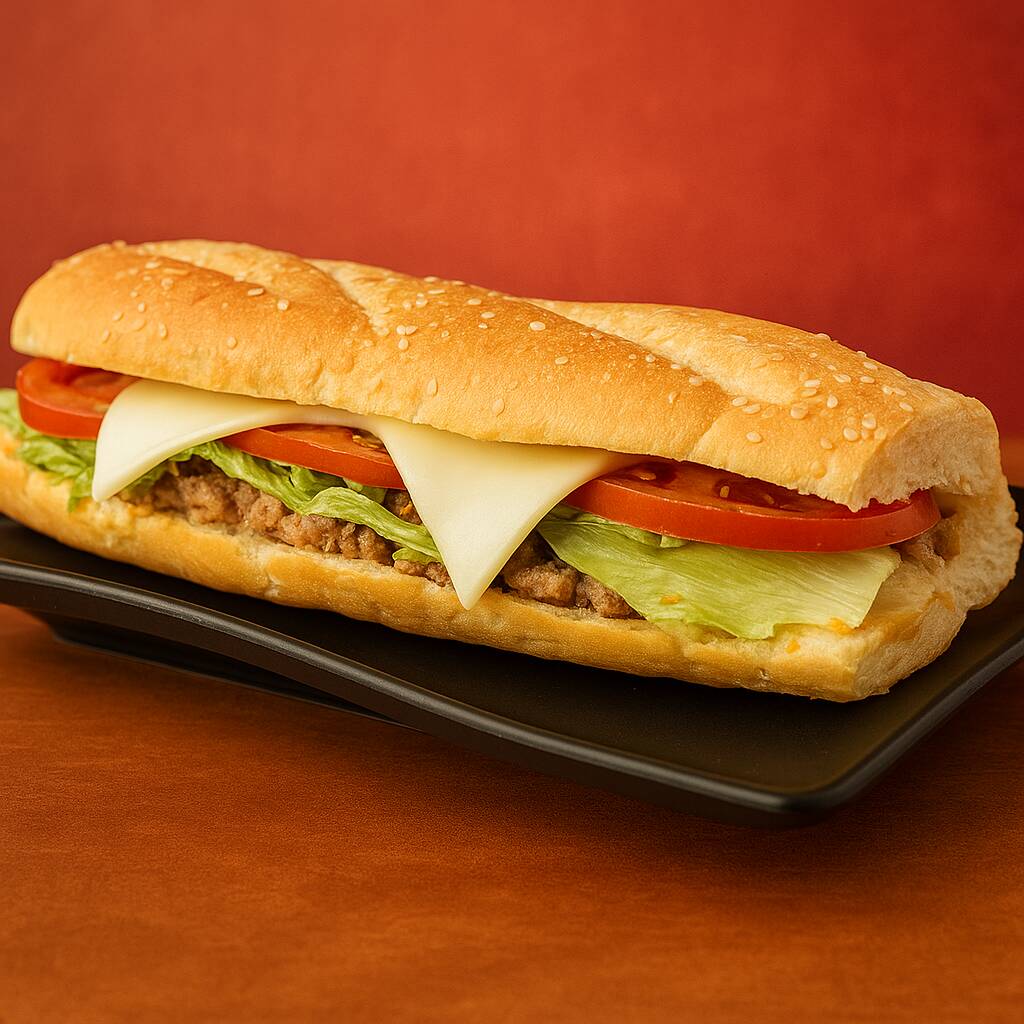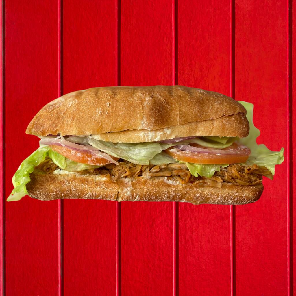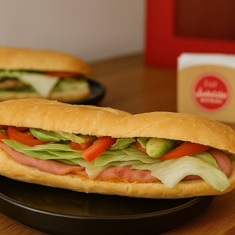Baguette de 30 cm relleno de pierna y vegetales (lechuga, jitomate, cebolla, aguacate).