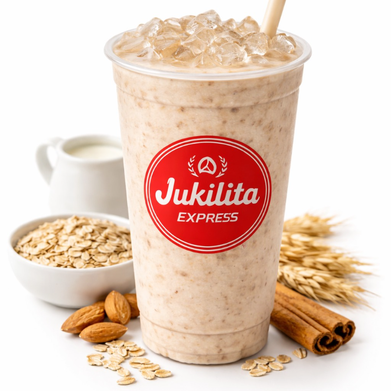 Avena fria preparada con leche vainilla y textura cremosa. Refrescante y ligera para iniciar tu dia en Jukilita Express
