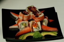 (Cangrejo, anguila, queso, aguacate, ikura, bañado con salsa dulce y arare)