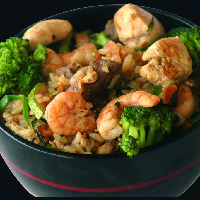 Camaron, pollo, brocoli, cebollin, champiñon en salsa teriyaki y brandy