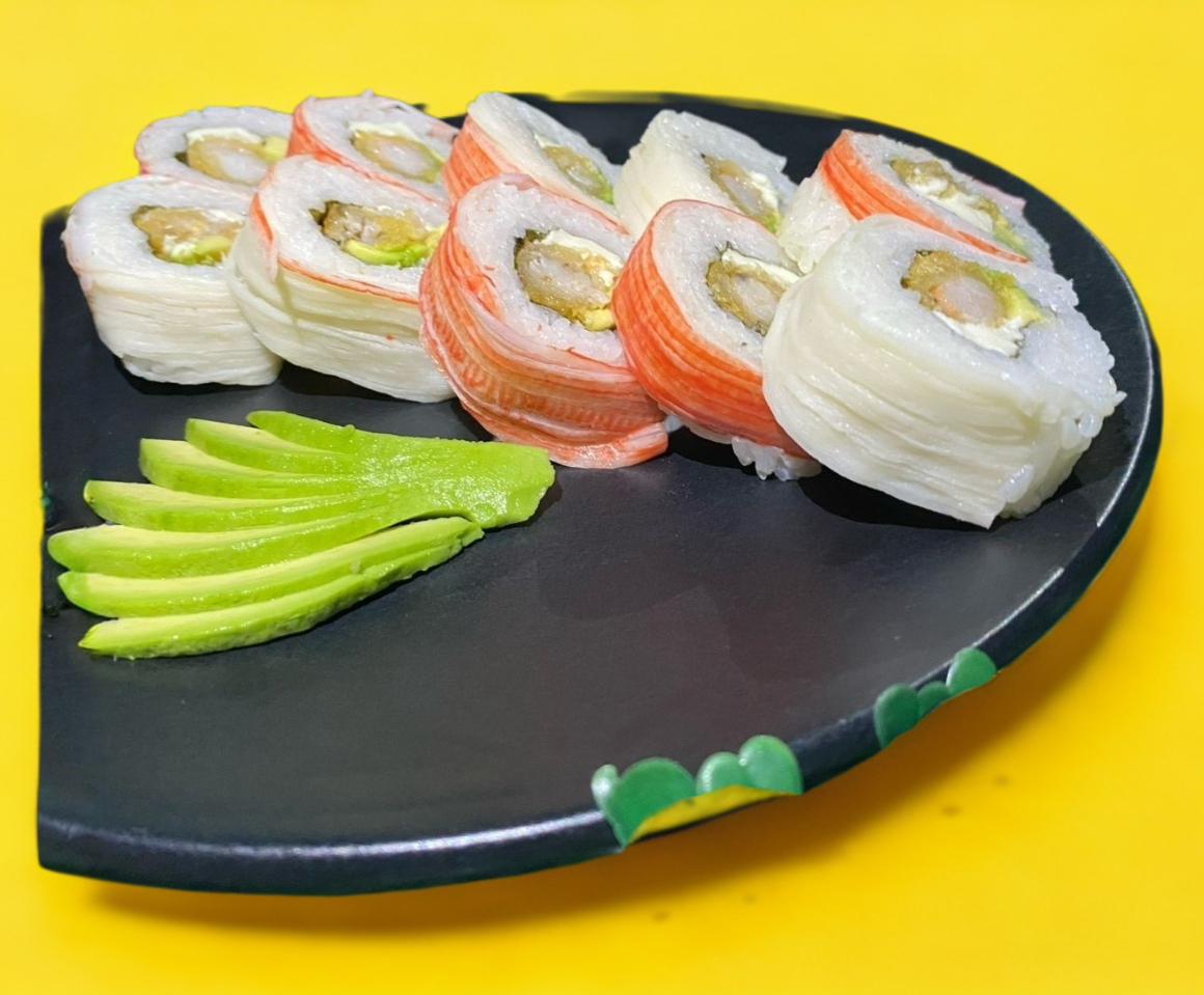 Rollo Cubierto Con Surimi,Relleno De Camaron,Aguacate Y Queso Crema