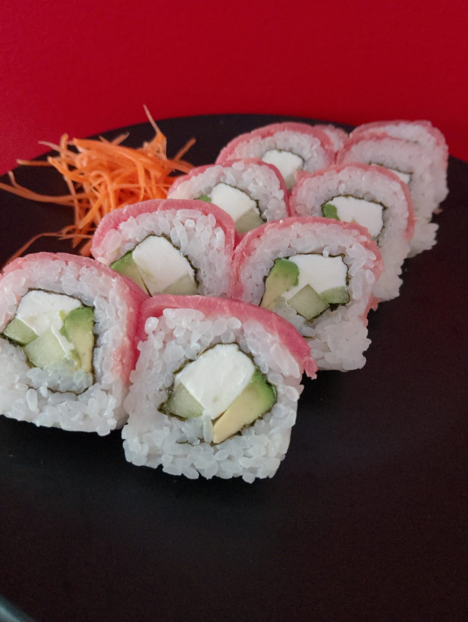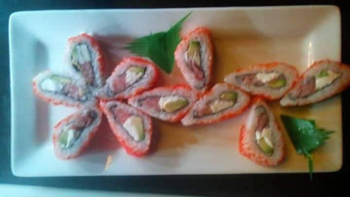 Rollo Cubierto Con Camaron,Relleno De Atun,Pepino,Queso Crema Y Aguacate.