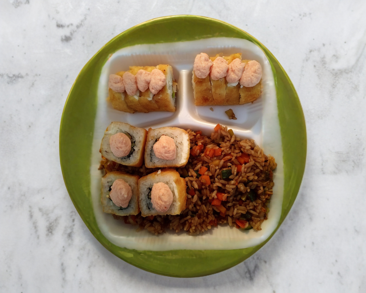 Sushi pintamaki, media pechuga Katana, porción de yakimeshi de verduras
