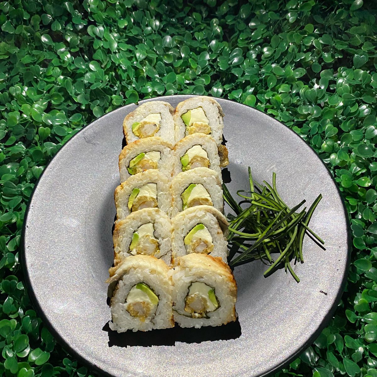 1 Rollo 10 bocados Cubierto Con Aguacate Y Masago,Relleno Con Pepino, Salmon Y Anguila.
