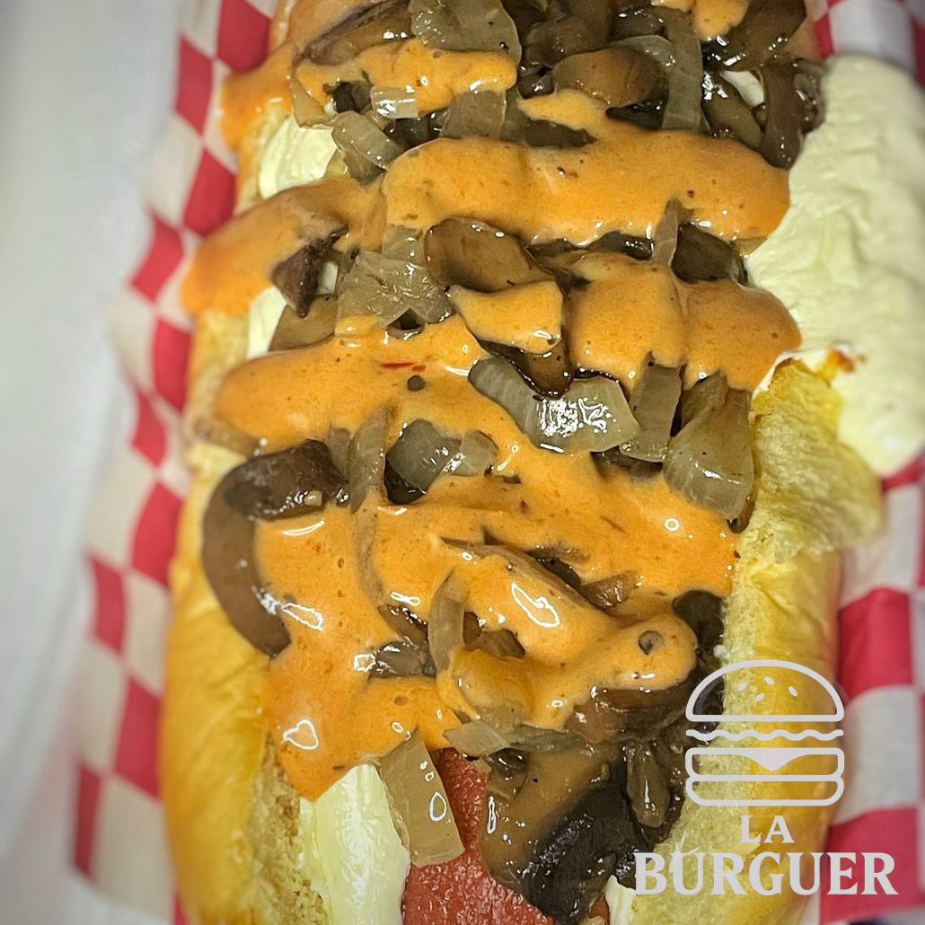 Salchicha Jumbo coronada con una generosa capa de champiñones y cebollas salteadas, y el toque final de rico queso gratinado y fundido.