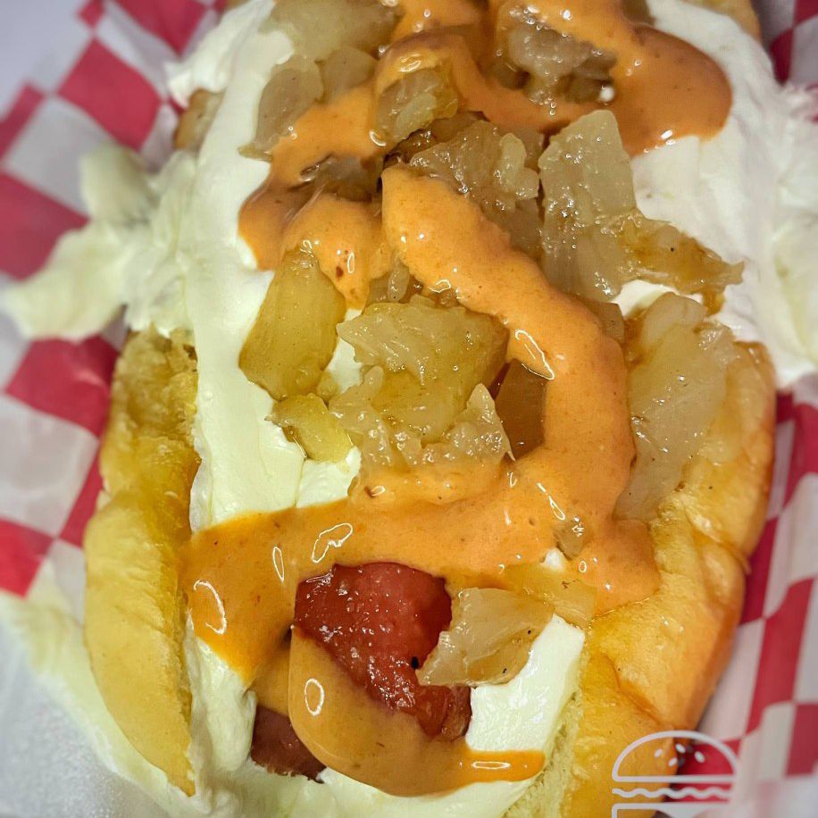 Salchicha Jumbo cubierta con rico queso gratinado y abundantes trozos de piña asada. La combinación perfecta entre lo salado y lo dulce, ¡una explosión de sabor en cada mordida que no querrás perderte!