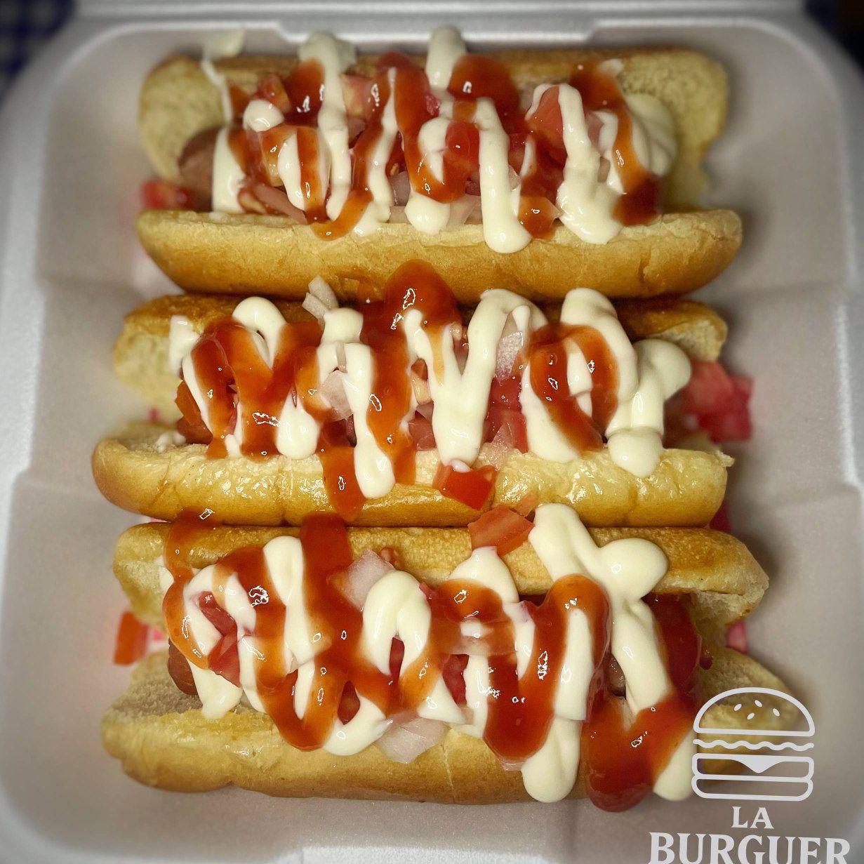 Tres hot dogs de tamaño estándar, cada uno con salchicha envuelta en crujiente tocino. Aderezados con la combinación clásica que amamos: fresco tomate y cebolla picados, y el zig-zag perfecto de mayonesa y cátsup.