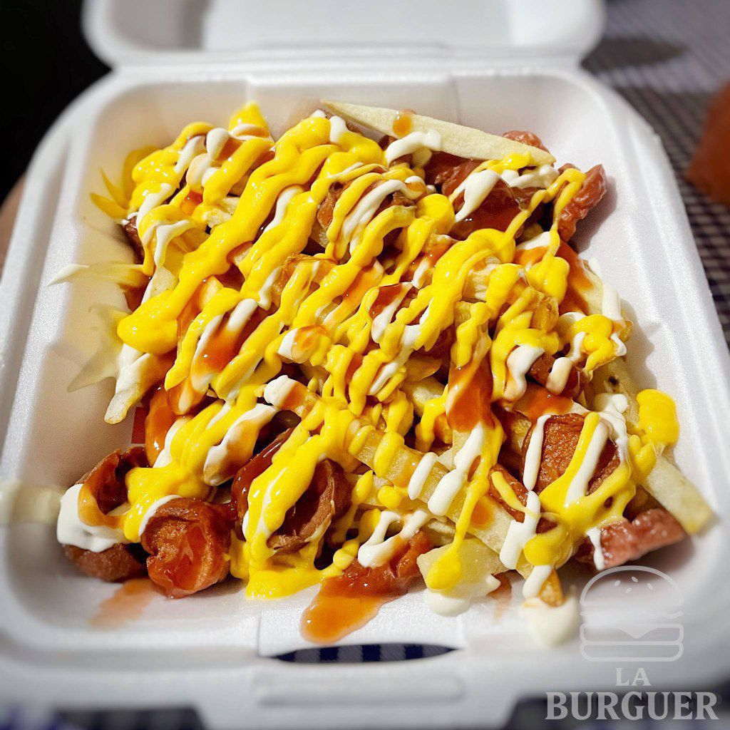 Nuestras papas crujientes, servidas con trozos de salchicha frita y bañadas en cremosa salsa de queso cheddar fundido. Acompañadas de la clásica mayonesa y cátsup para un sabor épico. ¡Simplemente irresistibles!